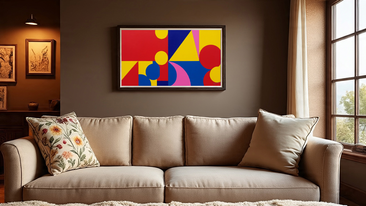 This digital abstract artwork bursts with energy through geometric shapes and vivid primary colors. Circles, triangles, and squares collide in a harmonious dance of form and contrast. A modern statement piece for lovers of bold design and visual rhythm.