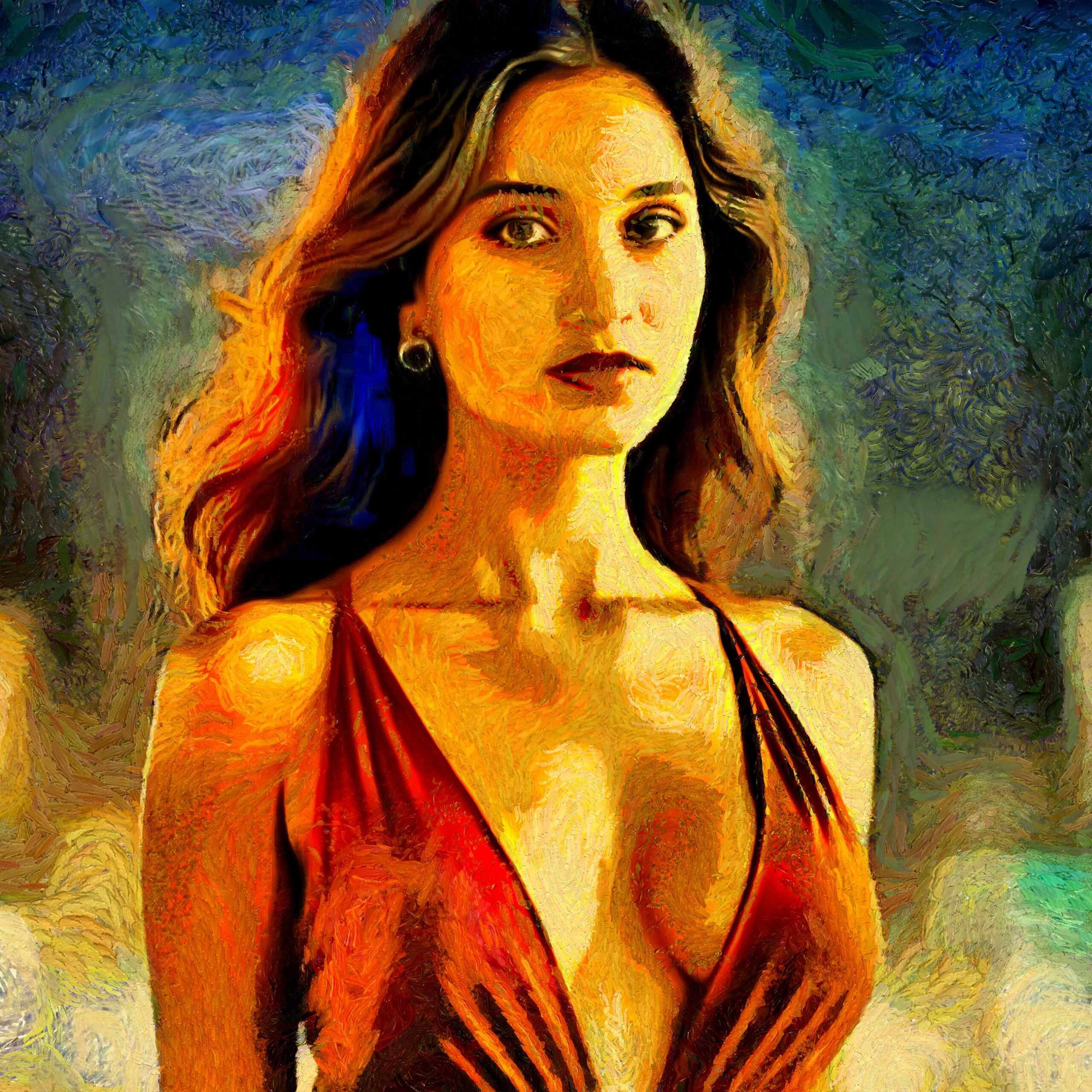 This digital artwork is a celebration of bold femininity and painterly elegance. A woman stands poised in a deep red dress, her long hair flowing and her gaze steady. The swirling background of blues, greens, and yellows adds movement and emotional intensity, reminiscent of classical oil paintings.