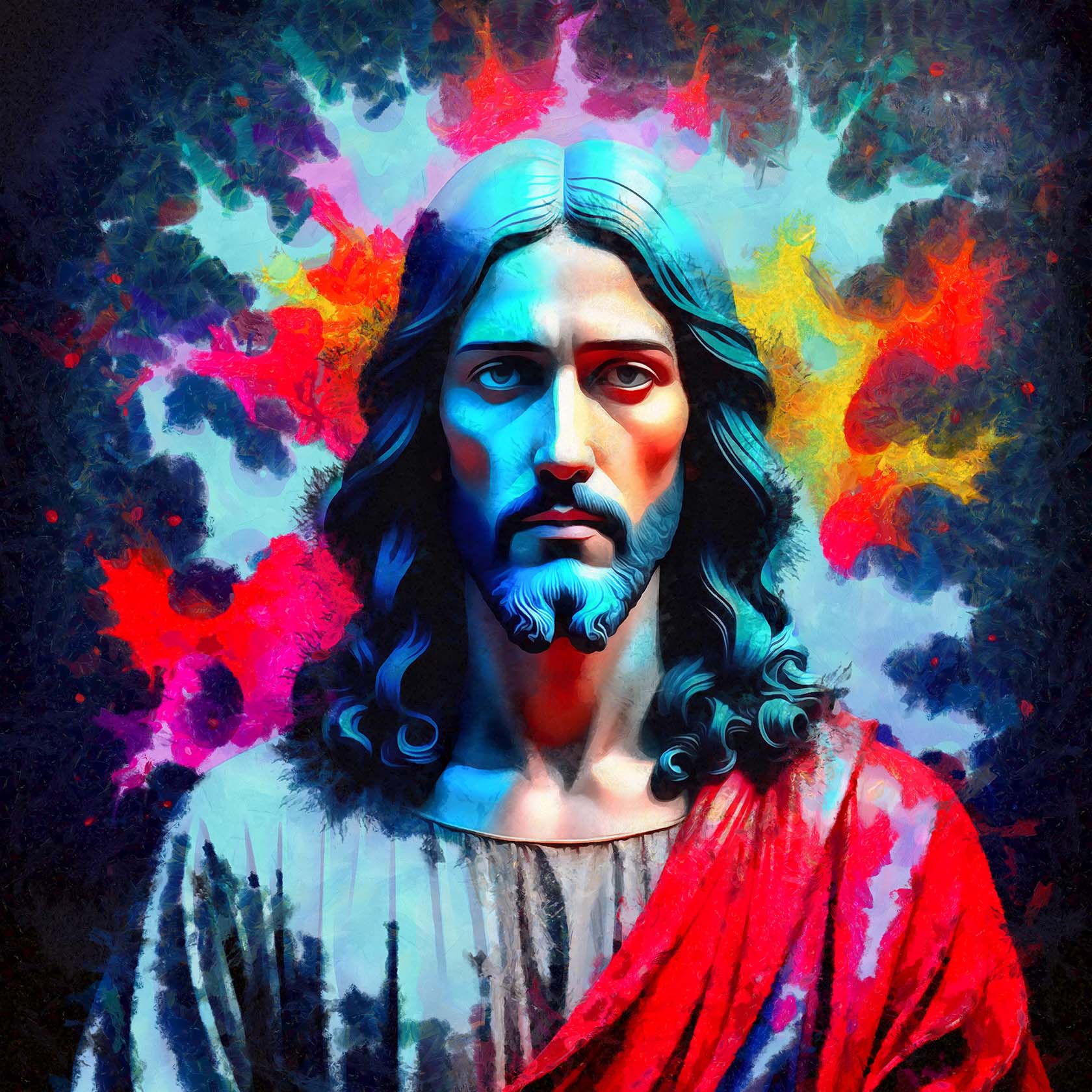 This emotionally charged digital portrait of Jesus Christ—AI-generated and reimagined in watercolor modern arts style—blends tradition with contemporary expression. The vibrant halo of colors, serene gaze, and surreal background evoke peace, divinity, and artistic brilliance.