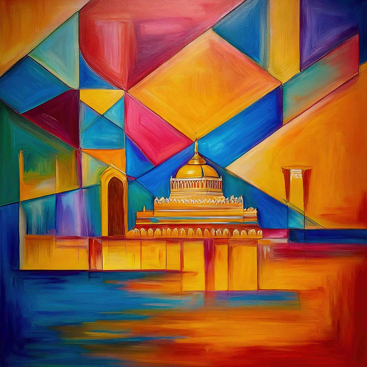 This striking digital painting blends sacred architecture with abstract geometry, creating a visual symphony of tradition and modernity. At the center stands a golden temple, its dome and arches glowing against a backdrop of vibrant polygons—blues, reds, oranges, and purples. The reflection below hints at water, grounding the celestial structure in earthly beauty.