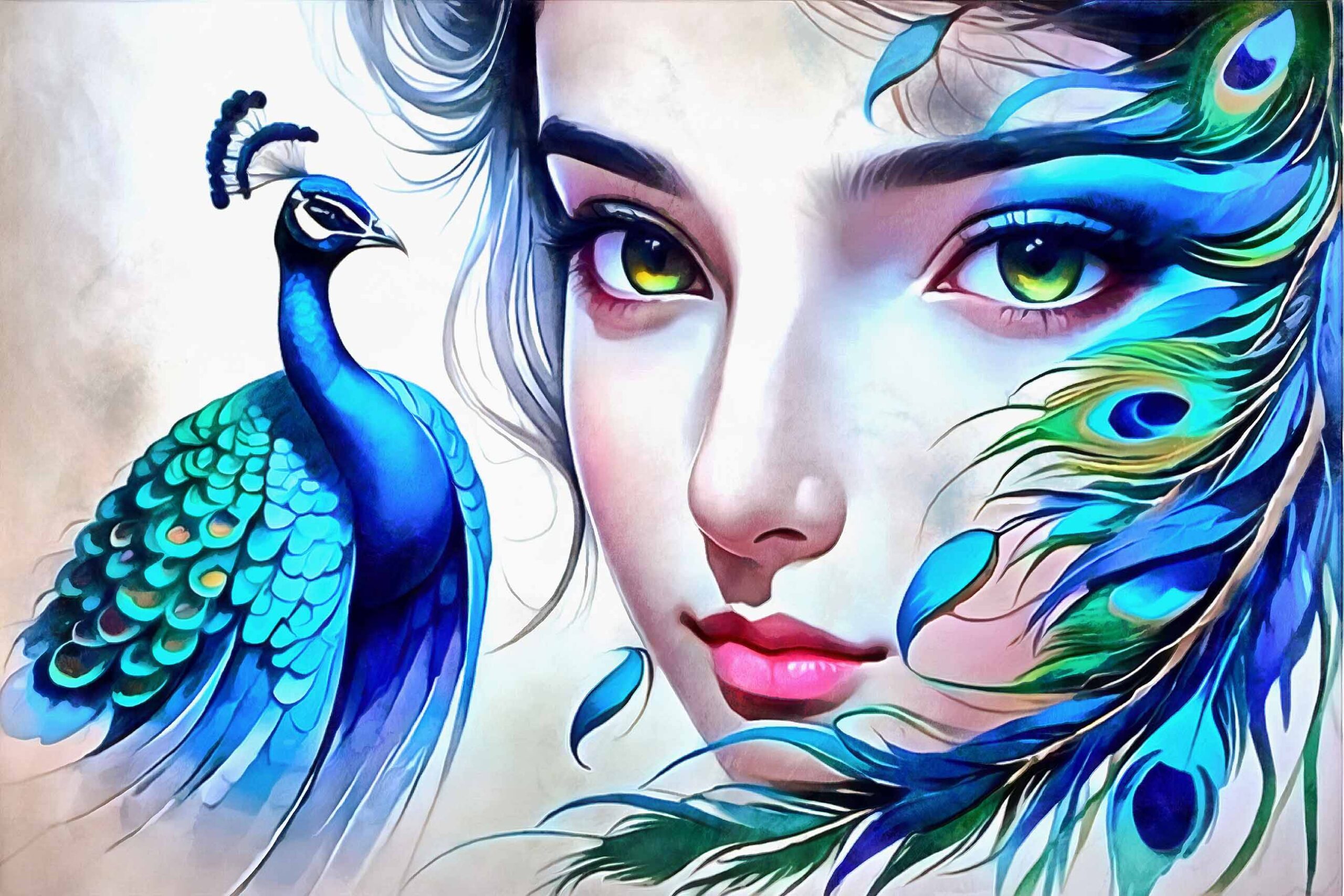 This soulful digital painting radiates serenity and spiritual depth. The figure’s calm expression, white headscarf, and illuminated face evoke reverence and inner peace. A vibrant feather in the background adds a mystical touch, symbolizing divine presence and grace.