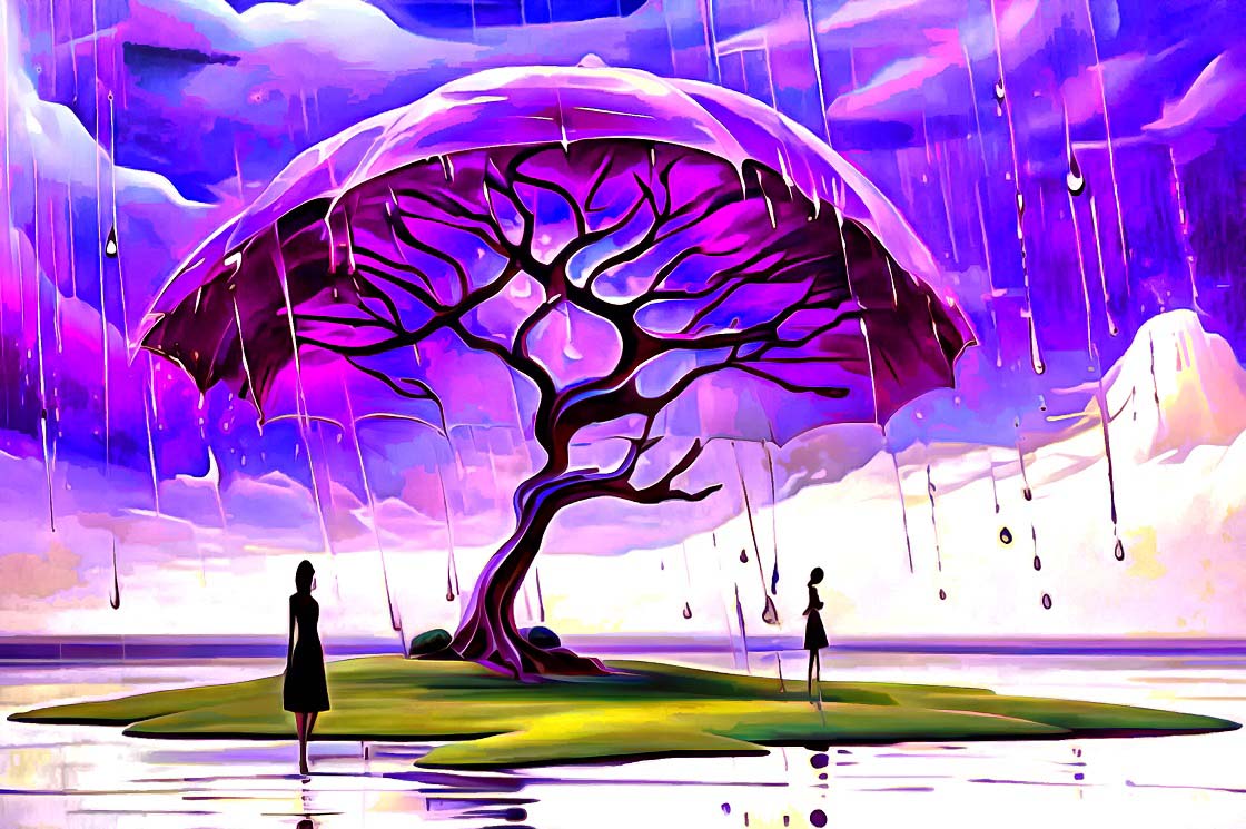 🖼️ Step into a dream where nature becomes sanctuary. This 36×24 inch digital artwork (300 DPI) features a fantastical umbrella-shaped tree, glowing in purples and pinks, sheltering two silhouetted figures on a tiny island. Surreal skies, falling rain, and radiant reflections create a scene of emotional depth and visual wonder.