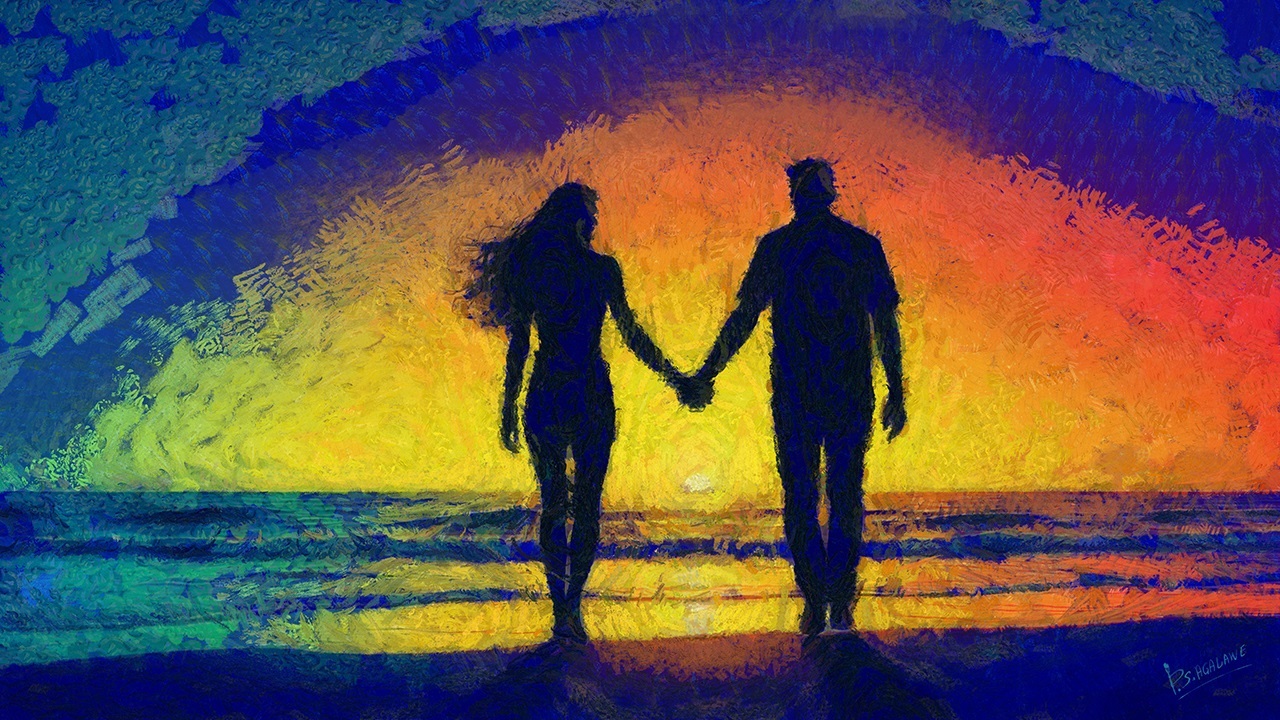 This impressionistic digital painting captures a silhouetted couple walking hand-in-hand along a beach at sunset. With vibrant skies and gentle waves, it evokes warmth, connection, and serenity. Perfect for romantic decor or heartfelt gifting.
