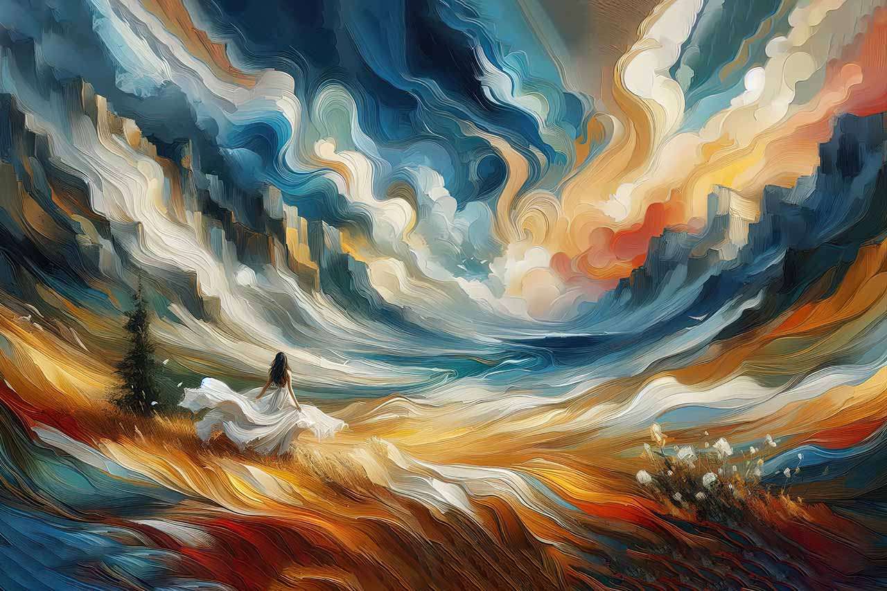 🎨 This surreal digital painting captures a moment of quiet movement and emotional depth. A lone figure in a flowing white dress walks through a golden field, her silhouette merging with the windswept grasses. The sky above swirls with dramatic brushstrokes in shades of blue, orange, and gold, evoking a sense of cosmic energy and inner journey.