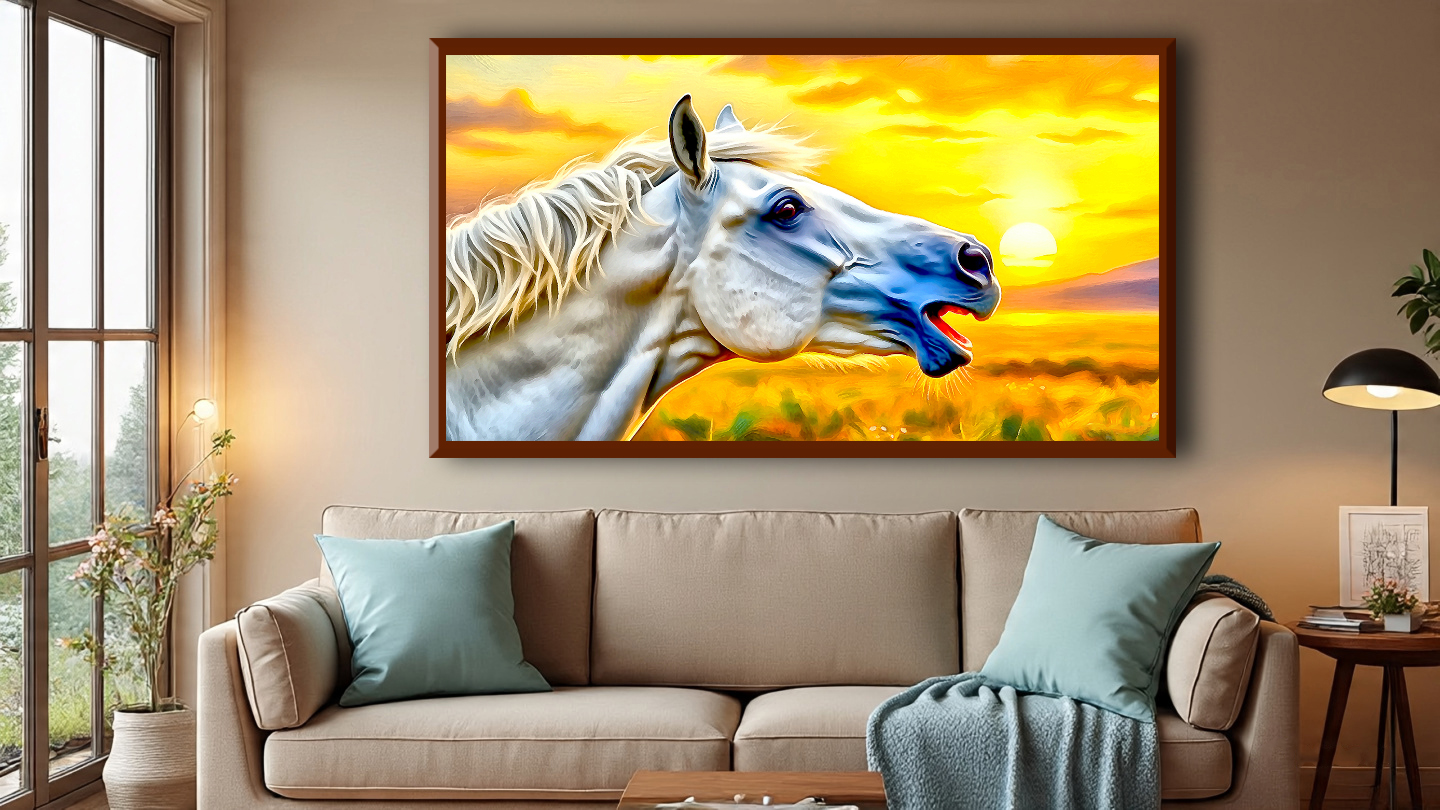 🐎 A vibrant digital painting of a white horse against a fiery sunset—where freedom meets artistic fire. Perfect for décor, gifting, or soulful inspiration.